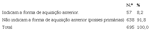 Quando comparamos as terras declaradas compradas com as herdadas, nota-se os seguintes resultados para as compradas: aquelas que apresentaram preço e tamanho se constituíram em nove (2,6%); aquelas que apresentaram tamanho sem preço declarado, 80 (23,1%); aquelas com preço sem tamanho, 267 (77,2%), e, por fim, sem preço e sem dimensão, 198 (57%). Como se vê, os subconjuntos resultantes ficaram muito fracionados, o que não permite tirar conclusões históricas significativas e consistentes.
