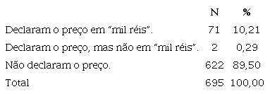A informação atinente a preço e associada à dimensão da posse ser-nos-ia bastante útil e possibilitaria o conhecimento do preço por hectare, se a posse tivesse sido demarcada. Apenas uma pequena parte das declarações apresentou o preço das terras a despeito do mecanismo de compra e venda ter sido bastante comum do ponto de vista estatístico, 45%, conforme apontamos acima. Cerca de 10% declararam o preço em mil réis, enquanto outros 89% não declarou preço algum, fosse em mil réis ou em ouro, como era ainda uma prática comum da época. O conjunto das terras declaradas compradas perfaz a soma de 346 unidades, das quais 50 (14,5%) apresentaram preços e 296 (85,5%) não os apresentaram. O conjunto das terras declaradas herdadas perfaz a soma de 154, das quais 11 (7%) apresentaram preços e 143 (89%) não os apresentaram. Vale sublinhar que a grande maioria das posses não declarou tal informação, apresentando lacunas na documentação.