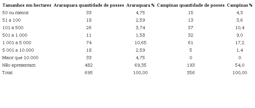 Quando extraímos, para efeito de comparação, os tamanhos das posses de terras e os organizamos por classes (grandes agrupamentos de dados), encontramos o seguinte resultado para Araraquara e Campinas, respectivamente: na grande faixa que vai dos 50 a mil hectares, 12,66% e 27,3% das declarações correspondiam ao grupo dos proprietários das menores porções de terras. Na faixa de 1.001 a 10.000 hectares, encontramos 17,9% e 18,6%, temos aí os proprietários donos de posses de tamanho médio. Finalmente, acima de 10.000 hectares, tivemos 4,75% em Araraquara e 0% em Campinas. Destacam-se as proporcionalidades semelhantes para as duas regiões no agrupamento médio. Já no grande grupo dos maiores proprietários, observa-se o que foi apontado por Bacellar (1997) em seu estudo sobre as terras dos engenhos do Oeste paulista. Esse afirmou que as dimensões das mais recentes eram maiores do que aquelas de povoamento mais antigo, por exemplo, as que estavam situados no vale do Paraíba do Sul, na região vicentina. Segundo ele, os efeitos dos processos de herança teriam ao longo do tempo fragmentado tais propriedades. Numa visão de conjunto, destaca-se que a região de Araraquara possuía uma maior frequência de porções maiores de terras, o que a caracteriza como área típica de fronteira.