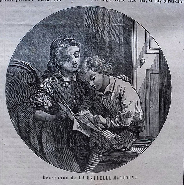El grabado presenta una escena de lectura de una niña y un niño vestidos elegantemente en una sala amplia, en orden, y decorada con objetos suntuarios; sostienen un suelto de pocas hojas donde llega a leerse “La estrella matutina”. Leen en una habitación solitaria sin ayuda de un adulto, en posición cómoda. La mayor (es de destacar que sean niños de ambos sexos) parece estar leyendo en voz alta (lo que ejemplifica el modo de inclusión en la escena lectora aún no alfabetizado y alternativas de uso del ejemplar único de un soporte). LEM proyecta aquí un programa público de lectura, de formación de un público lector, de ciudadano, ingresando en el ámbito privado y educando la disposición para la lectura: “los que no saben leer o los ciegos no van a soportarla [a la publicación de LEM] -Para ellos no sería de provecho- El sol mismo de nada sirve a los topos y los murciélagos; pero entre aquellos que aman verdaderamente a su país y a El que lo hizo” (LEM Nº 1, p. 1).