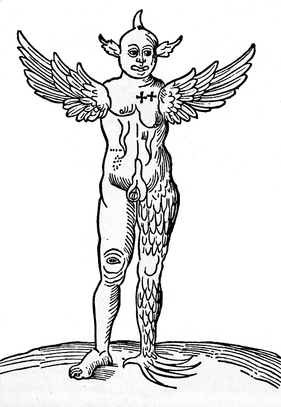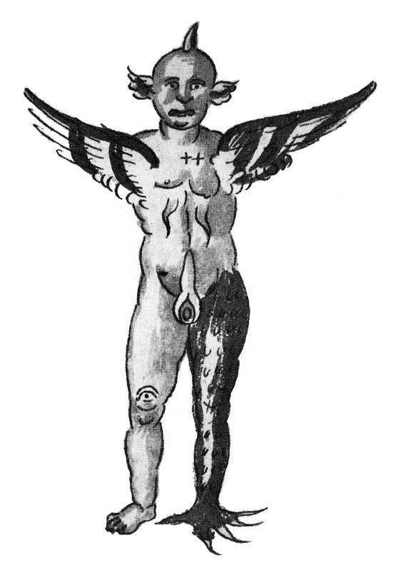 E a dì 11 di marzo 1511 [i.e., 1512], ci fu come a Ravenna era nato d’una donna un mostro, el quale venne qui disegnato; e aveva in su la testa un corno ritto in sù che pareva una spada, e in iscanbio di braccia aveva due ali a modo di pilpistrello, e dove sono le poppe, aveva dal lato ritto un fio, e dall’altra aveva una croce, e più giù, nella cintola, due· serpe, e dove è la natura era di femmina e di maschio; di femmina era di sopra nel corpo, e ’l maschio di sotto; e nel ginocchio ritto aveva uno occhio, e ’l piè manco aveva d’aquila. Lo vidi io dipinto, e chi lo volle vedere, in Firenze. (LANDUCCI, 1883, p. 249-250).