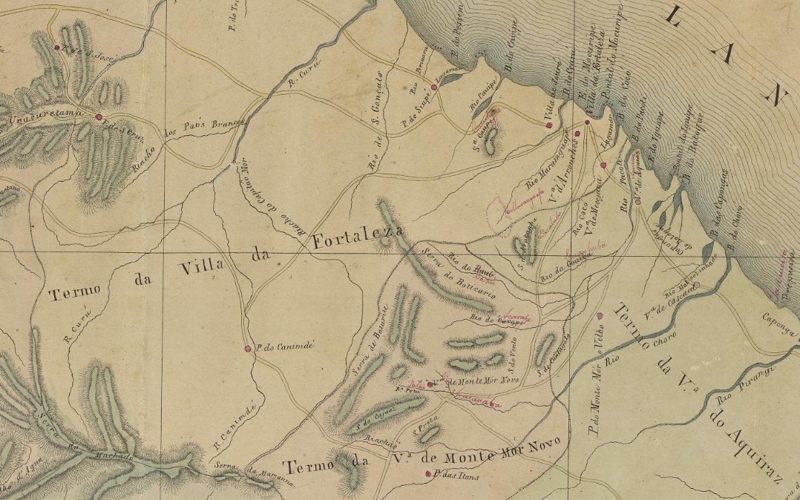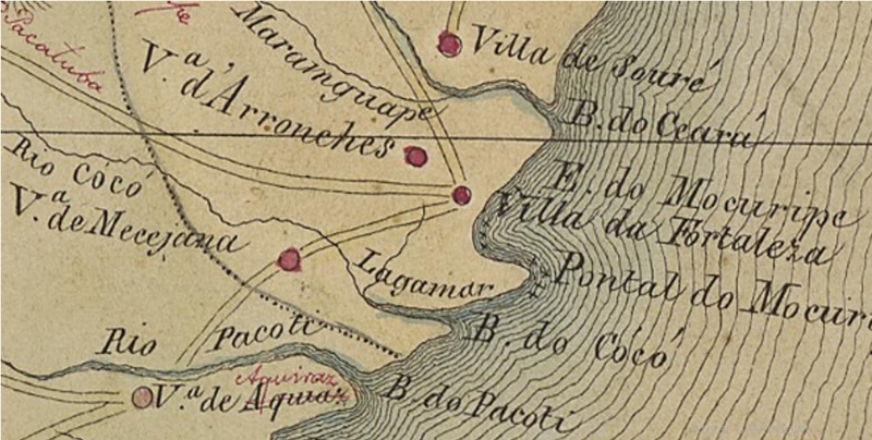 A cartografia da época revela as confusões dos limites territoriais municipais e o avanço de Fortaleza e Aquiraz sobre as terras das vilas de índios que circundavam a capital. Como vemos a seguir no detalhe do “Mapa da Capitania do Ceará”, de 1818 (Figura 3), a identificação dos termos das vilas de Fortaleza e Aquiraz ultrapassavam geograficamente a localização das vilas de índios de Soure, Arronches e Messejana, situadas ao redor da capital cearense. Encomendada pelo governo da então capitania, o mapa registra localidades mencionadas no memorial de Messejana, como os rios Guaiúba, Pacoti e Cocó. Ou seja, se nem mesmo a cartografia fazia referência aos termos dos municípios indígenas, as autoridades das vilas de brancos também não respeitavam as posses das terras dos índios, demarcadas em meados do século XVIII com a promulgação do Diretório.
