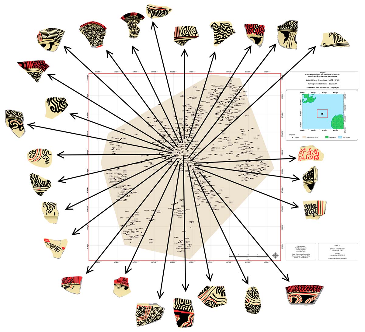 Coletas de superfície localizadas em duas estearias do rio Turiaçu, Cabeludo e Boca do Rio, evidenciam uma grande quantidade de artefatos pintados com alusão à pele da anaconda. Em recente estudo, Navarro (2018a, 2018b) sugeriu que cada estearia possui um conjunto maior de esteios que coincide também com o local de coleta da maioria das peças pintadas, estatuetas e muiraquitãs. Nesse sentido, estes espaços poderiam corresponder aos locais destinados à coletividade da aldeia, onde se realizariam as festividades e reuniões do grupo. Nessas reuniões, em meio a comes e bebes, a memória do mito ancestral da cobra-canoa pôde ter sido entoada pelos povos das estearias (ver Figuras 9 e 10).