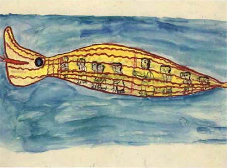 A futura humanidade tornava-se gente e crescia maloca por maloca, assim como uma criancinha que cresce ano por ano. Assim mesmo acontecia com eles. A embarcação vinha debaixo da água, como submarino. As malocas também estão debaixo das águas. Tanto é que a humanidade veio como “Gente de Peixe” (LANA e LANA, 1995, p. 31).