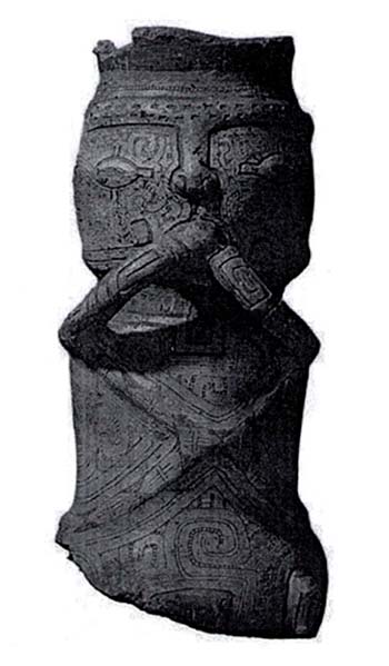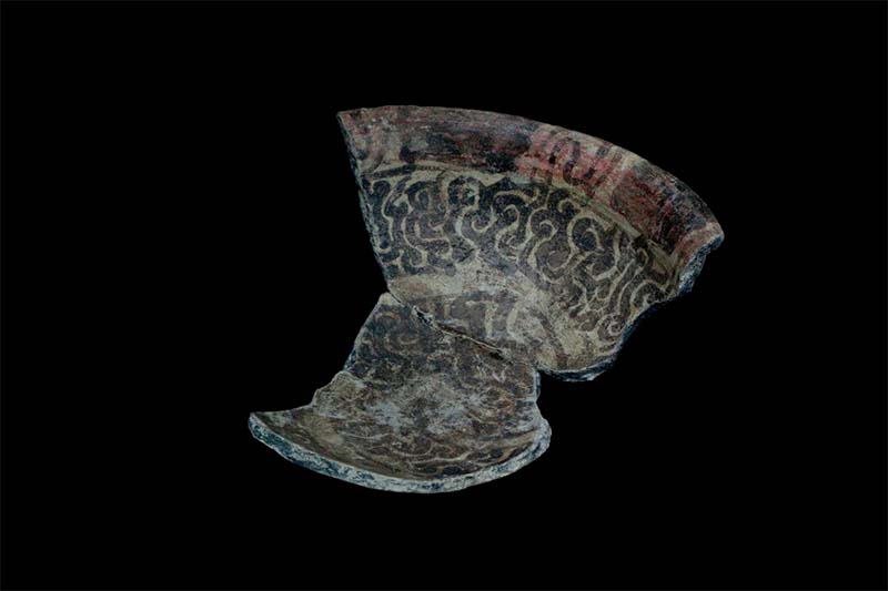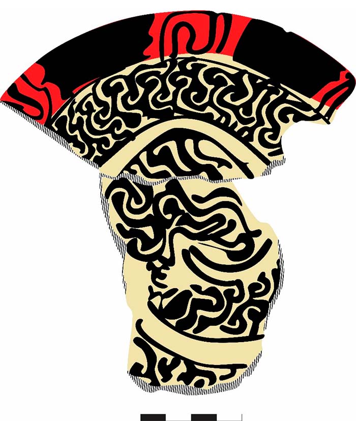 Ocorre que um dos principais temas de cerâmicas datadas no auge destas sociedades são desenhos de cor preta pintados sobre um engobo de cor creme (bicrômicos), e às vezes, associados também à pintura vermelha (policrômica). Um elemento iconográfico que se destaca é a presença de desenhos curvilíneos pretos ou em forma de ganchos que se encaixam uns aos outros (Figura 6).