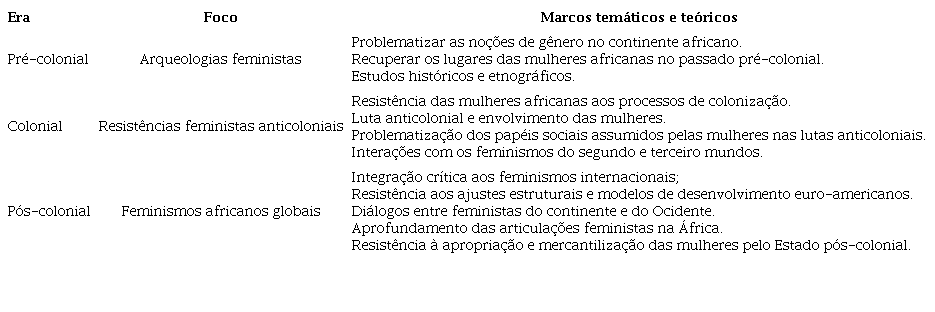 A ideia de eras articula o mosaico dos múltiplos feminismos africanos de uma maneira que, a um só tempo, respeita sua pluralidade e confere significado aos estudos produzidos acerca de cada um desses momentos históricos e políticos. Se o colonialismo e a colonização são peças fundamentais para interpretar os desenvolvimentos das mobilizações de mulheres no continente, então é possível usar esses marcos teóricos e históricos para situar as questões debatidas pelas africanas em cada uma das eras. Ao mesmo tempo que elas servem como marcos temporais, ainda que fluidos, as eras também permitem identificar os entrelaçamentos epistemológicos e metodológicos que caracterizam os estudos em cada uma delas. Dessa forma, o mosaico de feminismos africanos adquire significados que dialogam entre si, por vezes de forma cooperativa, por vezes sob fortes tensões.
