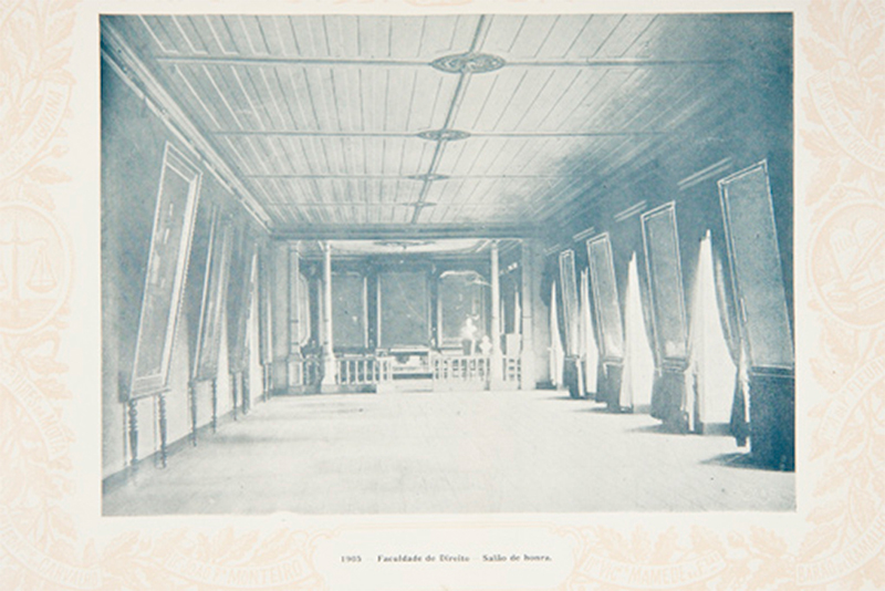 Uma galeria de retratos ali se formou paulatina e espontaneamente, no espaço que passou a ser designado, com o tempo, como Sala dos Retratos ou outras formas similares. Até o momento não foi encontrada nenhuma imagem que registrasse essa Galeria no século XIX. A imagem mais antiga encontrada até aqui é uma fotografia impressa em 1905 (Figura 1), na qual, no entanto, pouco se consegue distinguir dos retratos (BARBUY, 2018, p. 227 e 243-250).