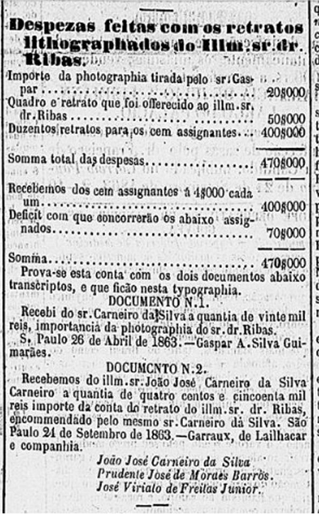 Quanto à encomenda - e ao pagamento - do retrato de Ribas, podemos ter certeza de que a discrição sobre o artista tinha fundamento. Afinal, ele era estrangeiro - mas não europeu -, e havia chegado a São Paulo há pouco tempo. Ou seja, ainda se firmava, na cidade, como ilustrador e retratista, e um comentário no Correio Paulistano indica o autor do retrato: