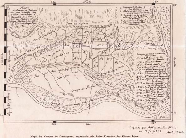 LIMA, Francisco das Chagas. Mappa do Campo de Guarapuava, com a divisão dos terrenos aplicados à Freguezia do Belem, Aldêa da Atalaya e Povoadores Portugueses. In: FRANCO, Arthur M. Diogo Pinto e a Conquista de Guarapuava. Curitiba: Museu Paranaense , 1943b. p. 206.