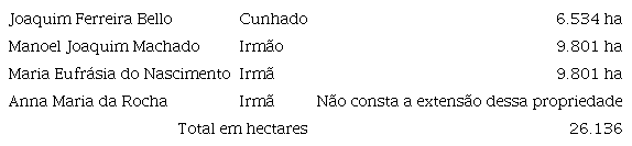 As terras apossadas pelo alferes Domingos Machado, denominada de Pau de Lenha, após sua morte e de sua família pelo grupo Kaingang do cacique Deggaembang, passou a espólio de seus herdeiros que as regularizaram no livro Registro do Vigário, em novembro de 1855. Um deles foi Joaquim Ferreira Bello, que registrou ter adquirido, por herança de seu cunhado Domingos A. Machado, uma propriedade de “légua e meia de comprimento e de largura 1 légua” ( VECHIA, 2017, p. 62), equivalente a 6.534 hectares. Outra parcela das terras do espólio de Domingos Machado foi registrada pelo seu irmão Manoel Joaquim Machado 14, ela tinha “1 légua e meia” de extensão de campos e matos, equivalendo a 9.801 hectares ( VECHIA, 2017, p. 62). Uma terceira propriedade fruto desse espólio foi registrada por Maria Eufrásia do Nascimento, irmã do alferes Domingos Machado, e seus herdeiros. Ela tinha “légua e meia em quadra”, com 9.801 hectares ( VECHIA, 2017, p. 91). Outra irmã de Domingos Machado, de nome Anna Maria da Rocha, também fez o registro de uma propriedade de campos recebida do espólio de seu irmão, mas de que não consta a extensão. As terras apossadas pelo alferes Domingos Machado nos territórios Kaingang do Nerinhé tinham uma extensão de mais de 26.000 hectares ( Quadro 2).