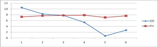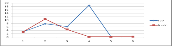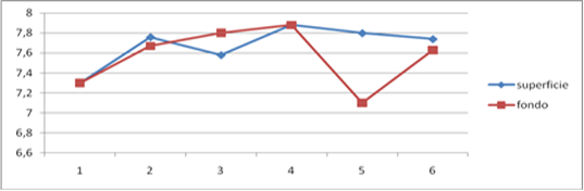 Al atender el comportamiento de estos parámetros en las estaciones de muestreo 4, 5 y 6 se observó un aumento no significativo del pH y disminución del oxígeno disuelto, lo que se atribuye a una máxima concentración de materia orgánica y por ende a mayores procesos biológicos. Este proceso se observa de manera similar tanto en superficie como en fondo, a excepción de la zona caracterizada por un delta donde convergen los ríos de Mérida, Táchira y Colombia, que alimentan al lago de Maracaibo.