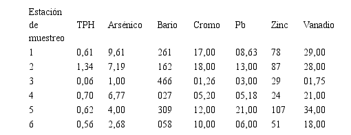 En relación a lo anterior se pudo evidenciar que la zona del estrecho estación 3 se puede definir como una zona de baja concentraciones de metales y la zona sur está influenciada por numerosas instalaciones petroleras y descargas de ríos. La estación 5 se define como zona de alta concentración de metales. Así mismo se puede decir que la estación de muestreo 2, ubicada en la bahía El Tablazo, representa una zona de medianas a altas concentraciones de metales, influenciadas por la desembocadura del río Limón y Pequiven, presentando concentraciones de As>V>Pb>Cr, lo cual corrobora la contaminación por hidrocarburos.