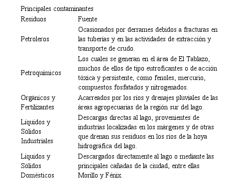 El análisis realizado sobre las diferentes propiedades físico-químicas de las aguas del lago de Maracaibo ha permitido identificar los principales contaminantes que en él se presentan, así como las posibles fuentes que dan lugar a esa contaminación (Tabla 4).