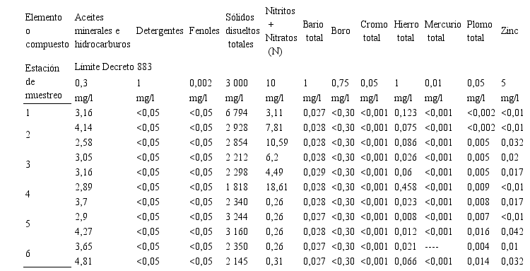 En cuanto a los metales pesados presentes en el agua se determinó que las concentraciones de Ba, B, Cr, Fe, Cd, Pb y Zn presentaron, en todas las estaciones de muestreo de superficie y fondo, valores por debajo de los niveles permisibles por el Decreto 883.