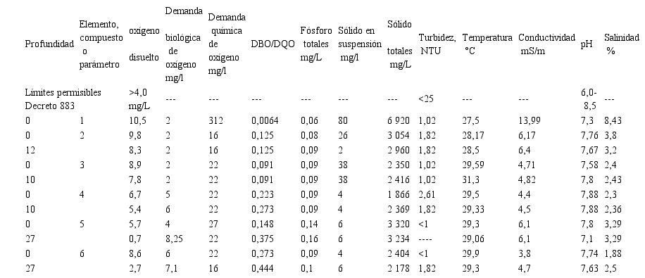 De igual manera, se demostró que las concentraciones de sólido disuelto fueron excedidas en las estaciones 1 y 4 en superficie y en fondo en la estación 4. También se observó que los nitratos y nitritos excedieron los límites en superficie en la estación 4 y en fondo en la 2. Finalmente, se detectaron niveles de oxígeno disuelto por debajo de los permisibles en la estación 5 y en la 6 en fondo. En referencia a los demás parámetros evaluados en los puntos de muestreo se mantuvieron por debajo de los límites permisibles del Decreto 883.