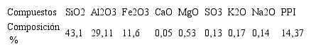 Los resultados de la composición química del material arcilloso natural, determinados mediante análisis por EAA, se muestran en la Tabla 1. El contenido total de SiO2, Al2O3 y Fe2O3, superior al 70 %, permite asegurar que los materiales caracterizados cumplen con las recomendaciones expresadas en la ASTM C 618-08 para materiales puzolánicos. Los altos valores de Al2O3 y SiO2 se asocian a la presencia de fases arcillosas y el alto contenido de hierro reportado indica la presencia de óxidos e hidróxidos de hierro, lo cual se corrobora en el difractograma de rayos X (Figura 2).