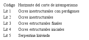 Se observan zonas con características diferentes en la corteza de intemperismo; en el área central las potencias superan los 15 m, mientras que en los alrededores de esta los valores son menores de 15 m. Existen, además, áreas donde la corteza prácticamente no se desarrolla. Aparecen representadas todas las litologías o zonas de la corteza y se nota un apreciable predominio de los ocres texturales limoníticos y los saprolíticos; estos últimos casi duplican los primeros. La mineralización está asociada fundamentalmente a los ocres texturales.