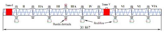 El trasportador estudiado consta de 10 tramos acoplados (figura 1). Los extremos de los tubos en formas de bocina son unidos mediante soldadura por arco de metal protegido (SMAW, por sus siglas en inglés) y bridas con tornillos.