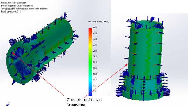 Se concluye que la unión soldada resiste las condiciones de cargas a las que está sometida, según criterio de Von Misses, ya que las tensiones máximas generadas por la soldadura del cordón se distribuyen a lo largo del mismo, sin que sobrepasen los valores peligrosos.