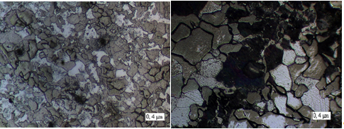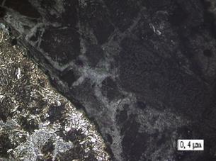 Se evidencia que en la unión soldada la estructura del metal depositado (parte oscura) presenta un fondo de granos muy finos del tipo troostitico y grano grueso con red de ferrita y la zona fundida del metal base (parte clara) presenta granos finos, alineados y aciculares, similar a la estructura basáltica, comportamiento propio de materiales que poseen una marcada diferencia de presencia de carbono en su composición.