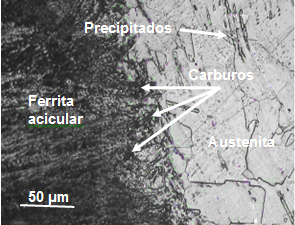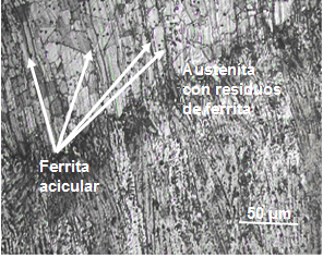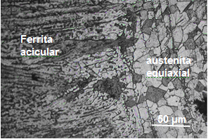 En la Figura 8, donde se ha obtenido una matriz de austenita con residuos de ferrita, también hay presencia de ferrita acicular en la ZIT, presumiblemente originado por la elevada velocidad de enfriamiento, a través del intervalo de transformación. En la Figura 9 se puede observar ferrita en una matriz austenítica, así como presencia de carburos (negro) dispersos cerca de la línea de la fusión.