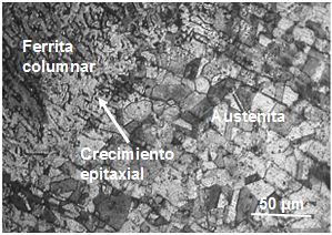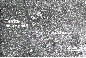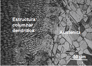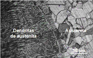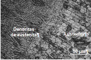 En la zona de fusión la microestructura es columnar con ramificaciones del tipo Widmastätten. En todas las soldaduras se encontró que, en las cercanías a la superficie de los cordones, la morfología se asemeja a una red dendrítica de austenita con una pequeña cantidad de austenita retenida entre los brazos, lo cual le otorga a este sector una morfología característica de los aceros inoxidables austeníticos.