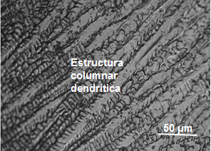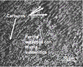 Las estructuras obtenidas con este electrodo son del tipo interdendrítica. La segregación del carburo producida, en ese tipo de estructura, es muy persistente y no se puede eliminar con tanta facilidad como el carburo intergranular; además, presenta una estructura columnar de dendritas gruesas, con un crecimiento epitaxial típico de los procesos de rápida solidificación a partir del material del sustrato.