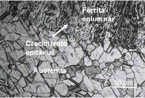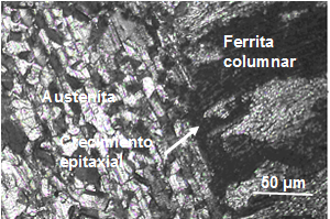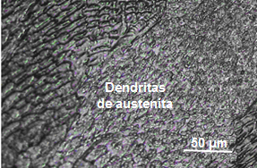 En estos casos la estructura austenítica del material base no afectado térmicamente no se ve afectada significativamente por las altas temperaturas que se alcanzan en la zona de influencia térmica (ZIT). De forma general, durante la unión con el electrodo E 316–16 se aprecia una matriz ferrítica, rodeada de células dendritas. El núcleo de las dendritas está formado por una fase austenítica, mientras que alrededor se encuentra la ferrita que ha sido la última fase en solidificar, con características tipo interdendrítica o intercelular.