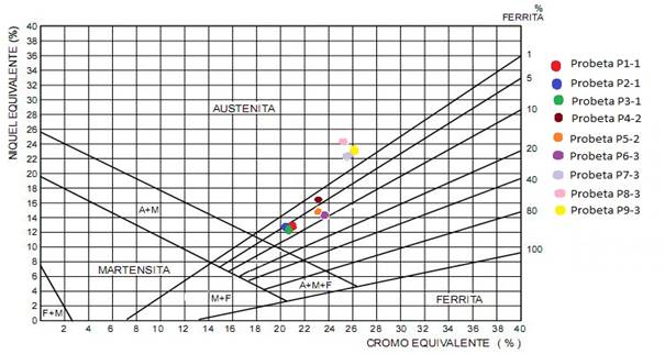 Los resultados obtenidos del Cr y Ni (Tabla 3) fueron representados en el diagrama de Schaefler (Figura 20); el punto correspondiente del metal depositado y la interrelación con la línea de la ferrita permitió obtener el porcentaje de ferrita en el cordón de soldadura.