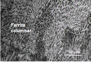 Las diferentes microestructuras revelan una estructura transitoria ferrita + austenita. En las Figuras 2, 4 y 6, que se corresponden con la ZF y la ZIT, se aprecia que en las zonas fundidas se ha obtenido una estructura de ferrita columnar, modo de solidificación que ocurre a altas temperaturas, desde el metal base hacia la línea de centro de la soldadura y en la zona de influencia térmica se observa el fenómeno de crecimiento epitaxial con granos columnares y alargados, donde los granos crecen en dirección del flujo de calor.