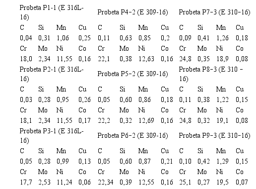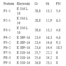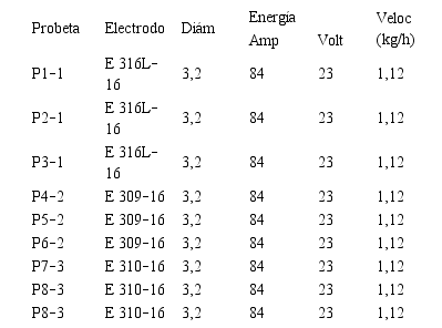 La composición química de cada uno de los cordones se realizó en un espectrómetro de masa ESPECTROLAB 230, con electrodo de tungsteno bajo arco sumergido en atmósfera de argón. En la Tabla 2 se muestra la composición de los depósitos obtenidos con los electrodos E 316L–16, E 309–16 y E 310–16.