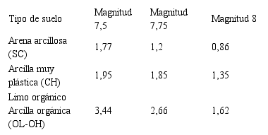 De la tabla podemos concluir que los suelos tipo (SC) son muy susceptibles a licuar ante sismos de magnitud 8,0 y poco susceptibles ante sismos de menos magnitud, no siendo el caso del suelo tipo OL-OH, el cual no es licuable bajo ninguna condición.
