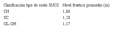 En los suelos tipo arcilla muy plástica el nivel freático se incrementa en dirección noroeste sureste (respecto a las rasantes actuales), alcanzando en las localidades del sector noroeste desde 1,40 m hasta 1,90 m. Hacia el centro, los suelos son de tipo arena arcillosa y puede establecerse una franja de dirección noreste suroeste en la que se presentan profundidades entre 1,10 m y 1,30 m; desde esa zona hacia el este, el nivel freático asciende gradualmente hasta localizarse a profundidades menores de un metro, como por ejemplo en el sector sureste del área de estudio. Tomando en cuenta el comportamiento del nivel freático se puede presumir que toda el área es licuable.