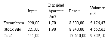 En la Tabla 1 se muestra un resumen de la cantidad de material transportado hasta la escombrera y stock pile para la simulación de 24 h, tanto del peso como del volumen movido. Se encuentra también la cantidad de camiones que ingresaron (Input), cada uno de 40 t.