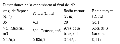 Conociendo el volumen y el ángulo de reposo del material se calcula la superficie afectada para la construcción de las pilas para un día. Por lo general, las escombreras tienen la forma de cono, dado a que el material adopta esta forma naturalmente. Para el cálculo de la pila con forma de cono truncado se toma un ángulo de reposo de material de 35°, que es un valor promedio del rango típico (30°-40°), según el Manual General de Minería y Metalurgia (2006).