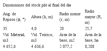 Conociendo el volumen y el ángulo de reposo del material se calcula la superficie afectada para la construcción de las pilas para un día, las cuales tendrán la forma de cono truncado. Se fija un radio menor de 20 m, para que los camiones puedan realizar maniobras en la parte superior de la pila. La fórmula para calcular el volumen es: