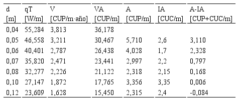 De acuerdo con las expresiones conocidas, Isover (2004a) plantea que las pérdidas de energía disminuyen con el aumento del espesor de aislamiento, lo cual coincide con lo expresado por diferentes autores (Huang & Zhang 2014; Zavattoni et al. 2014; Haiqian et al. 2012; Luamkanchanaphan, Chotikaprakhan & Jarusombati 2012; Bomberg 2013; Lulic et al. 2014). De ahí que se proceda a determinar para cada inversión en aislamiento el valor actualizado neto de los ahorros energéticos aportados y compararlo con los incrementos que supone la inversión.