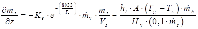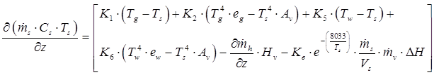 Ortiz y demás investigadores (2003) plantean que al realizar el balance energético para el gas (ecuación 6) se infiere que la variación del flujo de calor del gas a lo largo de la coordenada “z” depende del calor transferido por la convección y radiación por la combinación gas-sólido, y gas-pared, más el calor sensible añadido por el vapor de agua para la activación del carbón. Las variables K1, K2, K3, K4, K5 y K6 son los coeficientes de transferencia de calor por convección y radiación del gas al sólido (expresiones 7-12).