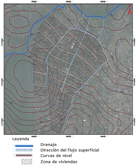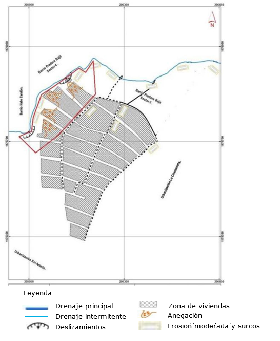 Riesgo alto: Sectores cercanos al drenaje, que presentan restricciones asociadas a sitios críticos de desborde del mismo, y que son zonas de impacto directo, asociadas a distancias menores a 25 m de este, con cotas muy cercanas a las de su cauce (entre 0 y 3 m de diferencia altitudinal). Los eventos se manifiestan con una intensidad relativamente débil, pero con una probabilidad de ocurrencia elevada y las personas, en este caso, están sobre todo amenazadas al exterior de las viviendas. Esta zona se encuentra ubicada hacia el noroeste del área de estudio, representada con el color rojo y es una zona denominada prohibición, de acuerdo con la Ley Orgánica de Riesgos Socionaturales y Tecnológicos. En esta área la construcción de las viviendas no es favorable, ya que están cercanas al drenaje principal y pueden inundarse en periodos de precipitaciones y sequía (Figura 8).