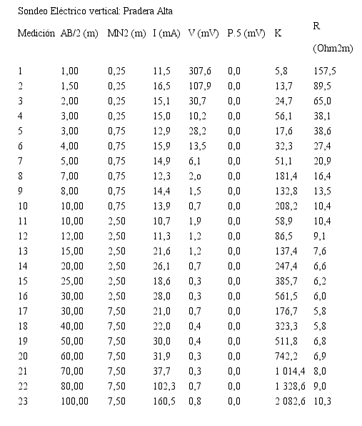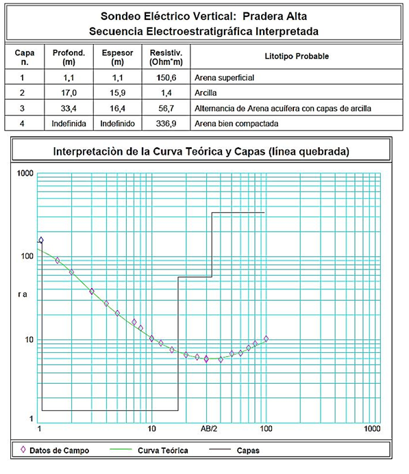 Según los resultados obtenidos con el Sondeo Eléctrico Vertical (Tabla 1) la primera capa, que tiene espesor y profundidad de 1,1 m, está constituida de arena con mediana resistividad, indicando que se encuentra seco y sin arcillas. Debajo de esta capa, y con un espesor de 15,9 m, se encuentra una capa completamente arcillosa la cual tiene una resistividad extrema de 1,4 ohm x m. Sigue una tercera capa de alternancia de arenas acuíferas con capas intercaladas de arcilla con un espesor total de 16,4 m y una profundidad de 33,4 m. La cuarta capa está constituida probablemente por una arena bien compactada debido al alto valor de resistividad aparente interpretado (336,9 ohm x m).