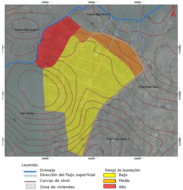 Se identificaron las áreas de amenazas y vulnerabilidad por inundaciones en la comunidad Pradera Alta sector 2, municipio Maracaibo, determinándose que el vertido directo de las aguas residuales sin control alguno tiene una influencia directa sobre el balance del nivel freático, más aún cuando hay suelos permeables y zonas de poca pendiente (< 5 %), en donde predominan los procesos verticales de escurrimiento (percolación) sobre los horizontales (drenaje superficial), lo que se incrementa con el periodo de intensas precipitaciones.
