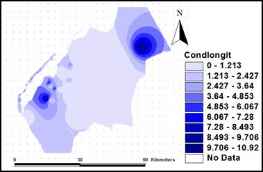 La Figura 8 revela que toda la zona cercana a la costa es predominante del agua salada y salobre (color rojo), por lo que los pozos perforados cerca de esta zona tendrán agua salada a salobre, producto de la intrusión salina que los afecta. En la medida que se aleja de la costa, más para el este y sur del área de estudio, el agua va transicionando de salada para salobre y luego se torna más dulce (color verde)