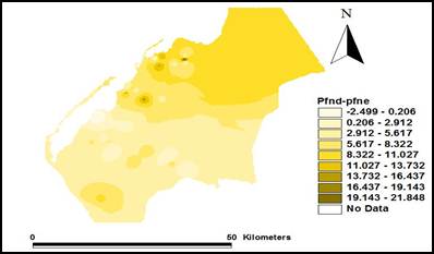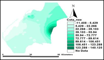 A la variable CNE fue atribuido el valor de 0,2, el tercero en la escala de pesos de la regresión múltiple. Este valor corresponde al hecho de que ella da una idea de la cantidad de agua existente en un pozo. La Tabla 8 muestra que el valor de pertinencia aumenta según el de la cota, presuponiéndose que cuanto mayor es esta última, mayor es la probabilidad de existencia de agua subterránea.