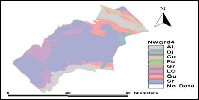 La variable mapa geológico (MG) es una red que tiene ocho intervalos (Tabla 7), resultantes de la subdivisión del intervalo [0;1], tomando como limites inferior cinco centésimas (0,05) y límite superior de cuatro décimas (0,4). La selección de estos valores obedece a criterios de expertos en función del comportamiento de cada formación, respecto a su potencial de aguas subterráneas. A continuación se describen las formaciones.