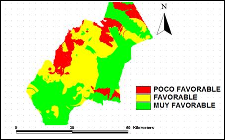 La integración de todas las matrices en un modelo de lógica difusa dio lugar a la obtención del mapa de favorabilidad. La unidad de decisión lógica realiza operaciones de inferencia para obtener, a partir de la evaluación de los niveles de compatibilidad de las entradas con las condiciones impuestas por la base de reglas, una acción a ser realizada por el sistema (Souza et al. 2010).