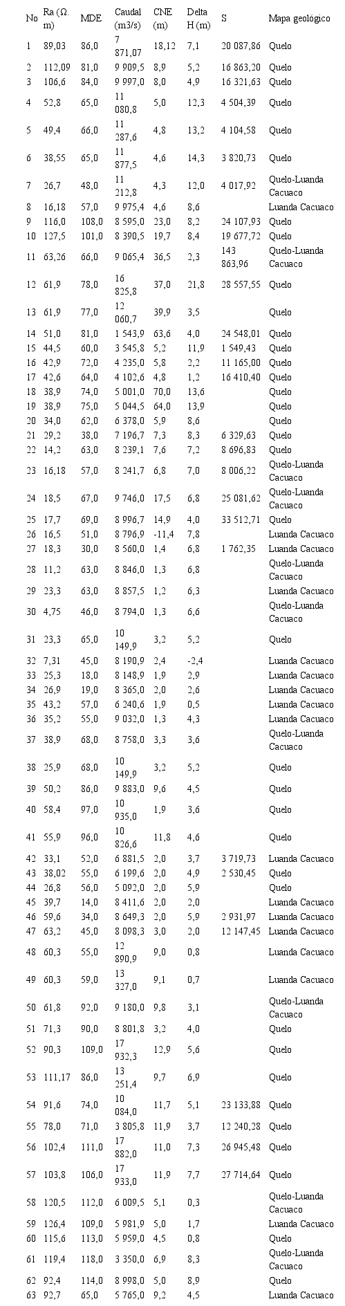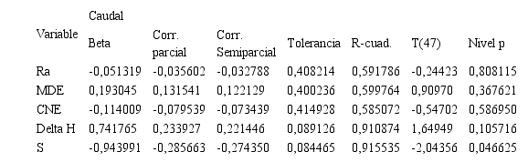 Se escogió el caudal como variable dependiente (Tabla 1). Los resultados de la regresión múltiple permitieron definir el orden de importancia de las variables, ubicando como la de mejor relación con el agua subterránea a la conductancia longitudinal (S). Las demás variables le siguen en este orden: delta H, MDE, CNE y Ra.