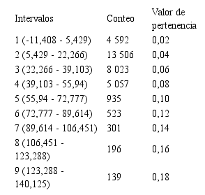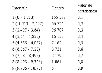 Las funciones de pertenencia se distribuyeron en los intervalos asumidos para cada variable, lo cual quiere decir que estos valores son los máximos que puede asumir una variable. Conforme concibió la extensión ArcSDM cada variable está dividida en nueve intervalos, por lo se tiene que dividir el valor de función de pertenencia de cada variable por el número de intervalos.