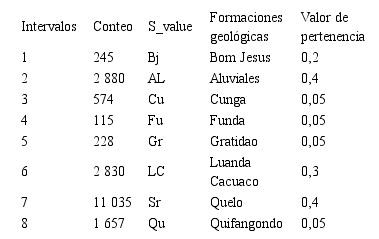 El valor mínimo atribuido al primer campo fue 0,01. Para saber cuáles son los valores que se tenía que atribuir se dividió 0,1 (que es el valor atribuido, de acuerdo a la tabla de pesos de regresión múltiple) entre nueve (9) que es el número de campos de la variable. El valor obtenido se fue sumando sucesivamente a los otros intervalos. La importancia de las resistividades tiene orden creciente en la Tabla 9. Por ejemplo, el intervalo número 1 corresponde a resistividades más bajas y el intervalo número 9 corresponde a las resistividades más altas. Después de distribuirse los valores de pertenencia a los intervalos se realizó la entrada de los datos al software.