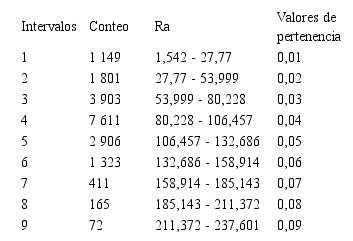 Por ejemplo: Para la conductancia longitudinal se tiene 0,9:9=0,1, valor mínimo que toma el intervalo que menos contribuye dentro de esta variable, en ese caso el intervalo (0-1,213) de la Tabla 4. Después se suma siempre 0,1 a los subsiguientes intervalos.