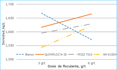 En la Figura 1 se observa el comportamiento de las densidades finales de las pulpas, para cada polímero, a cada una de las dosis evaluadas, estas se incrementaron proporcionalmente al incrementarse las dosis del polímero; el de mejores resultados es el Quimifloc N-30.